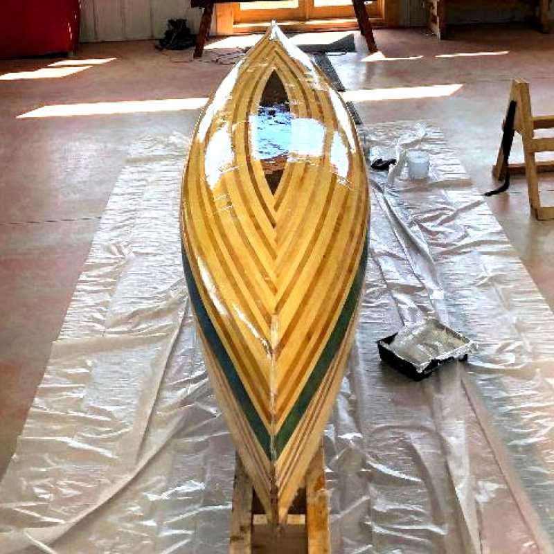 North House Artisan Josh Tolkan demonstrates adding a new strip to his in-progress cedar-strip…