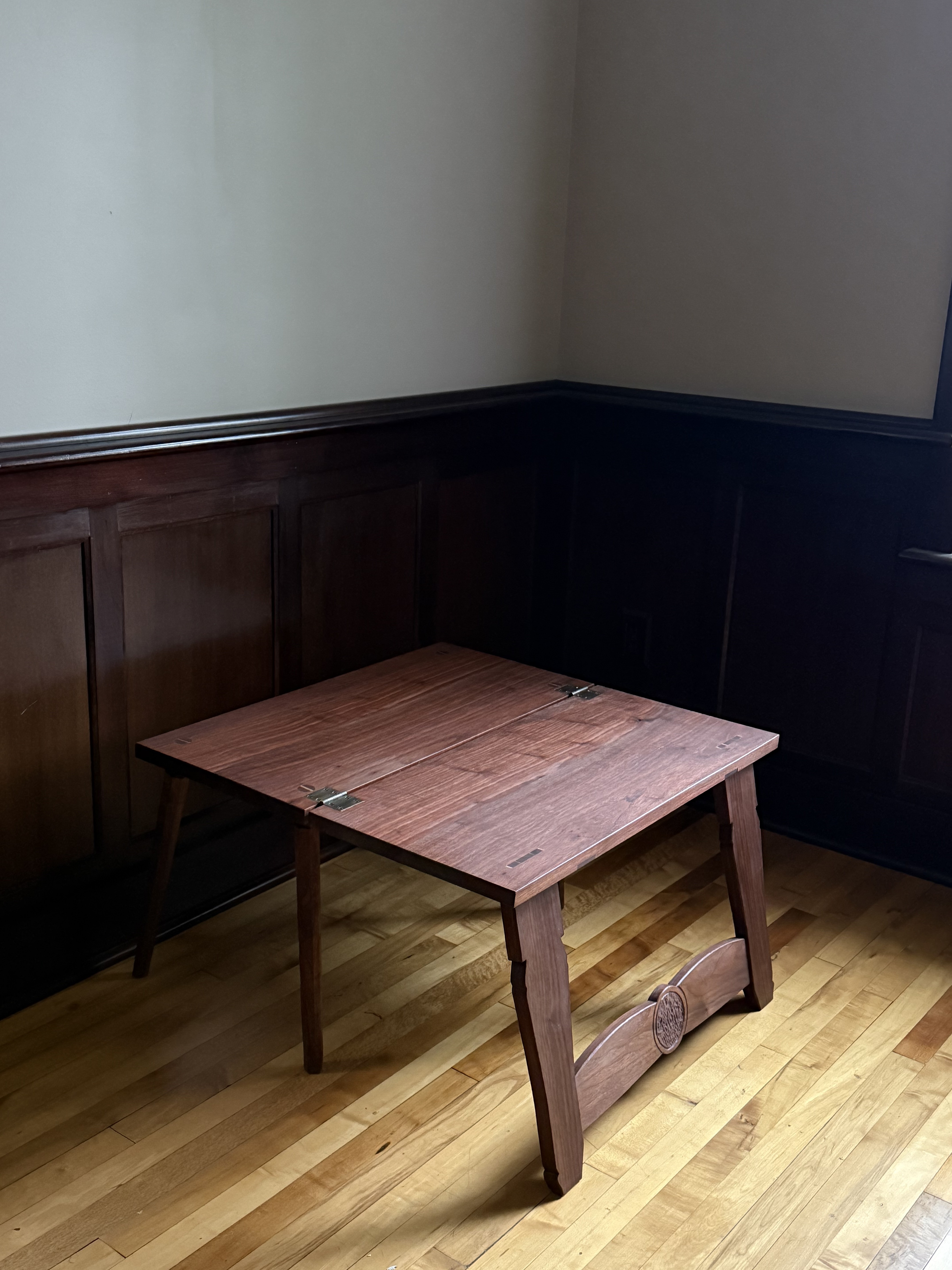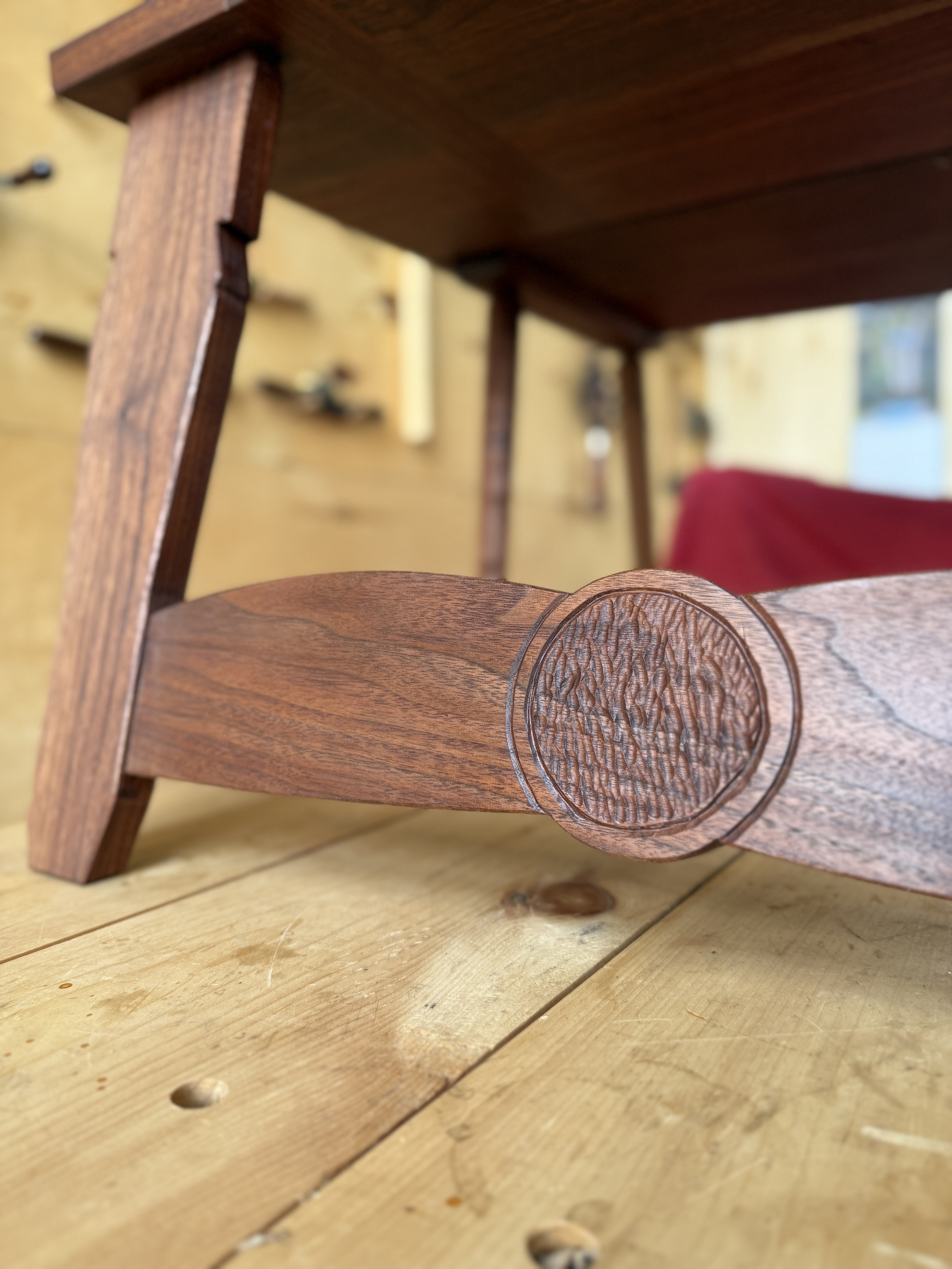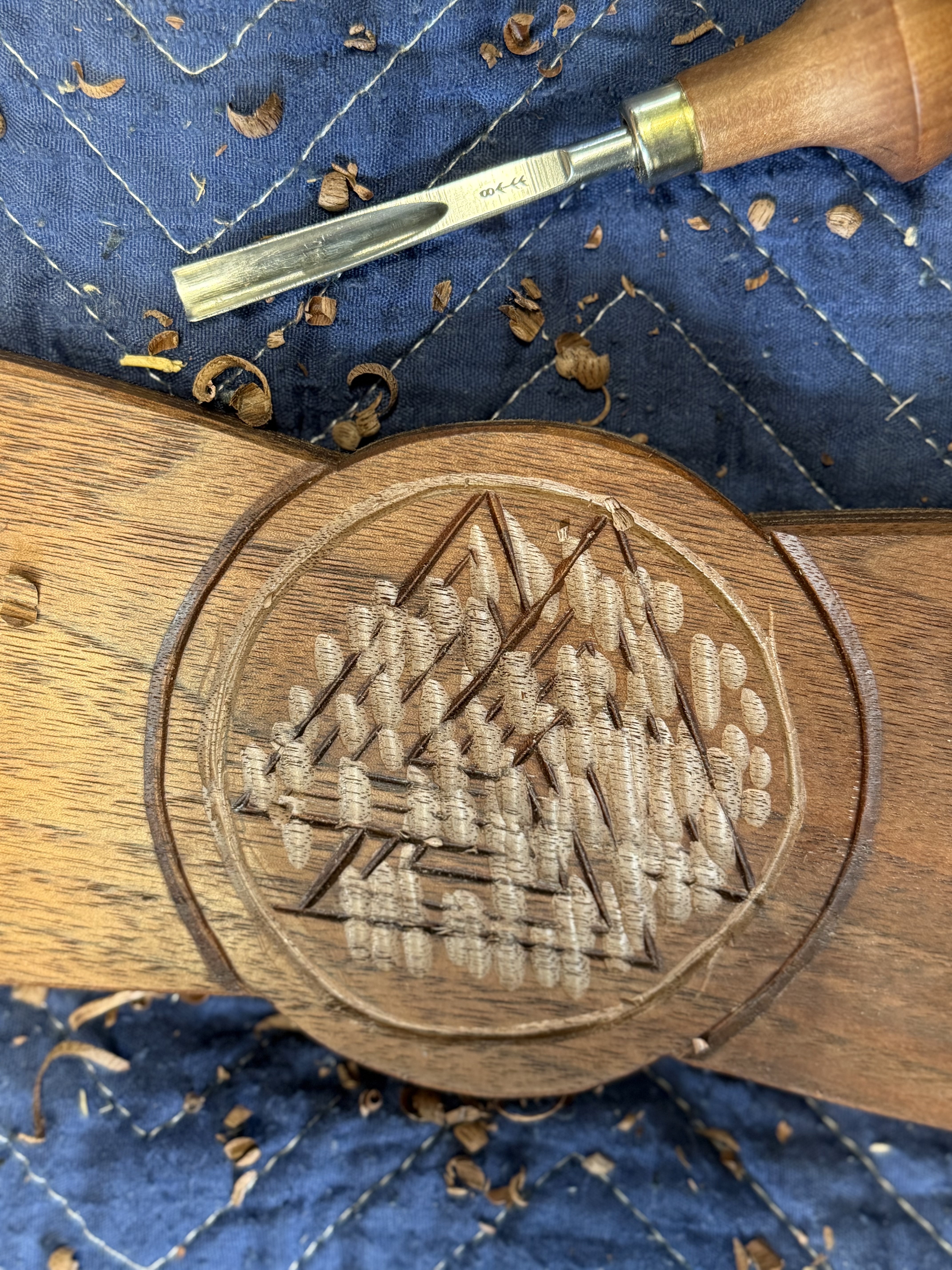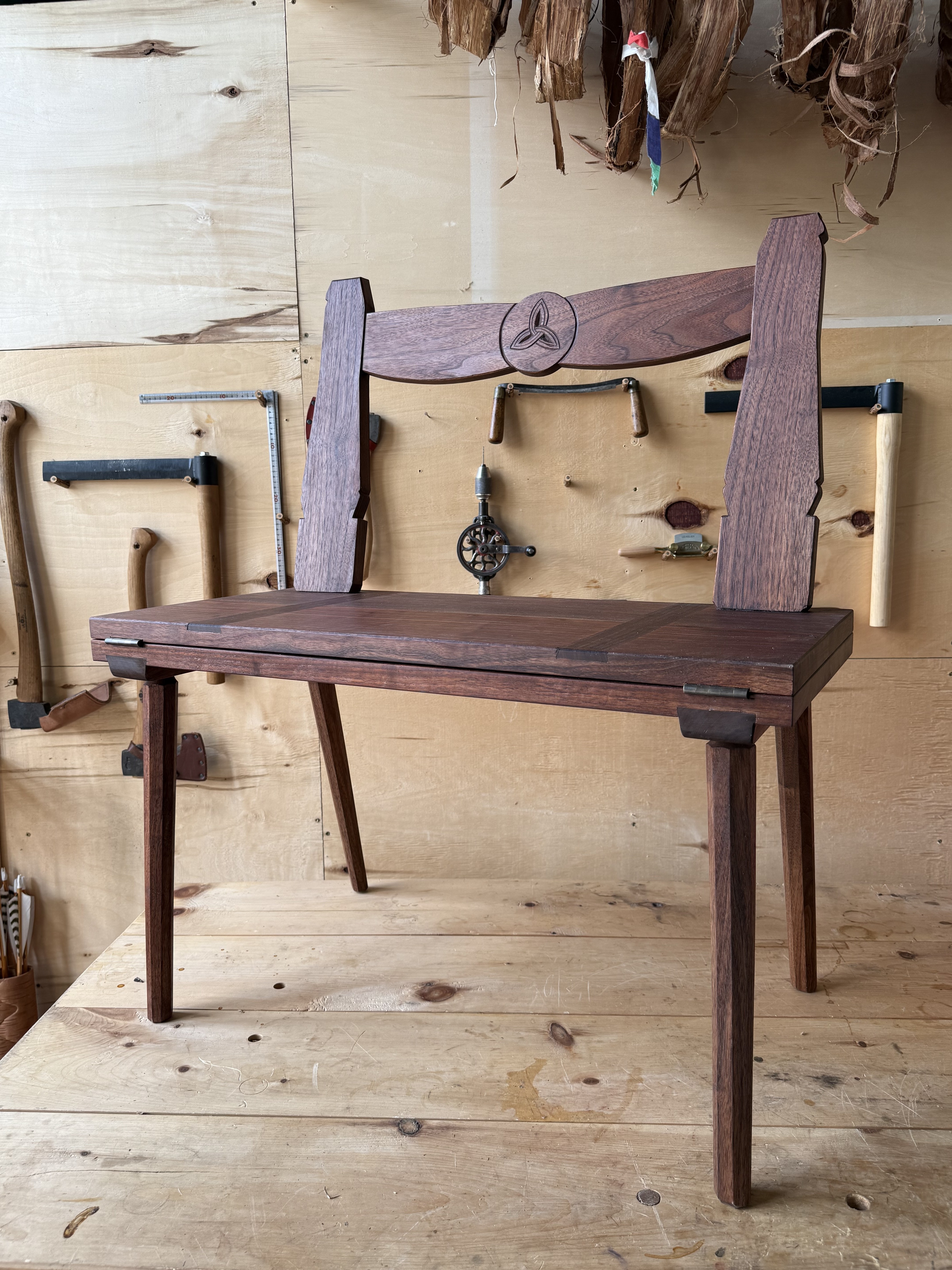 I built my bench using some air-dried black walnut I brought with me to Grand Marais. I wanted to practice my carving skills and began looking for designs to carve onto the bench’s crest. I considered floral motifs, but wanted something related to the bench’s Scandinavian origins. I found a couple of patterns in Karvsnitt, Jogge Sundqvist’s book on carving, a reference I often use for ideas and skill-building exercises. I decided to carve one pattern on the front of the bench, and a second pattern on the back, which would be seen when the bench was unfolded. I carved a triquetra on the front of the crest. This is a pattern of three interlocking arcs, and is associated with Celtic knotwork, although it also appears in Persian and Buddhist iconography. I didn’t want a complicated design, and I could carve this pattern using only a small v-tool and a knife.