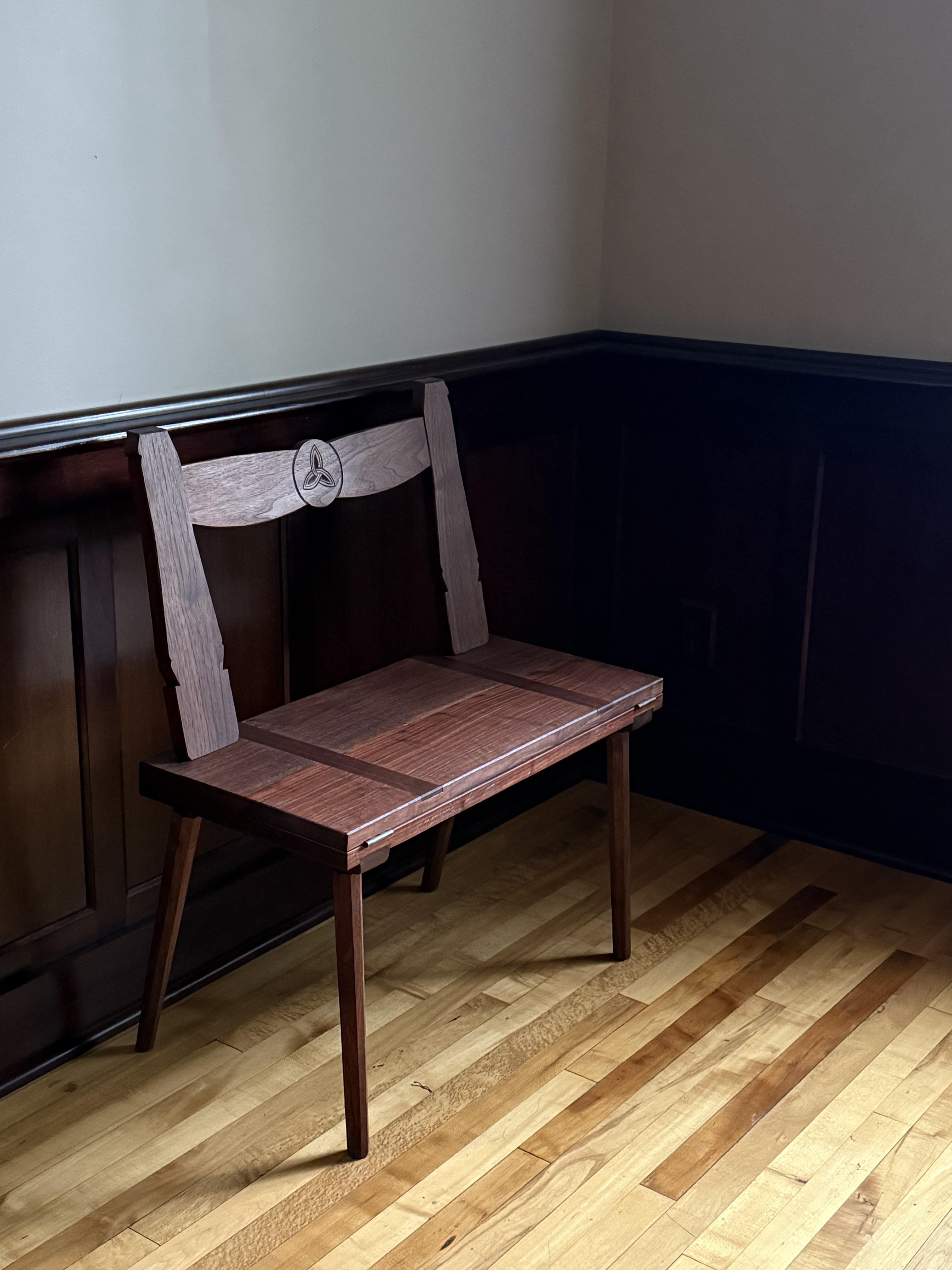This past spring, I designed and built a piece of furniture in my Grand Marais woodworking studio. At first appearing to be a minimalist bench, the seat hinges and its backrest becomes two more legs when the bench is unfolded to make a low table. It was inspired by benches I encountered in Sweden, and it fits into my interest for designing multi-purpose, modern furniture with traditional roots. The form itself relies on staked joinery, which is a type of woodworking I teach, and building the bench requires a combination of chairmaking and cabinetmaking skills, making it a fun challenge.