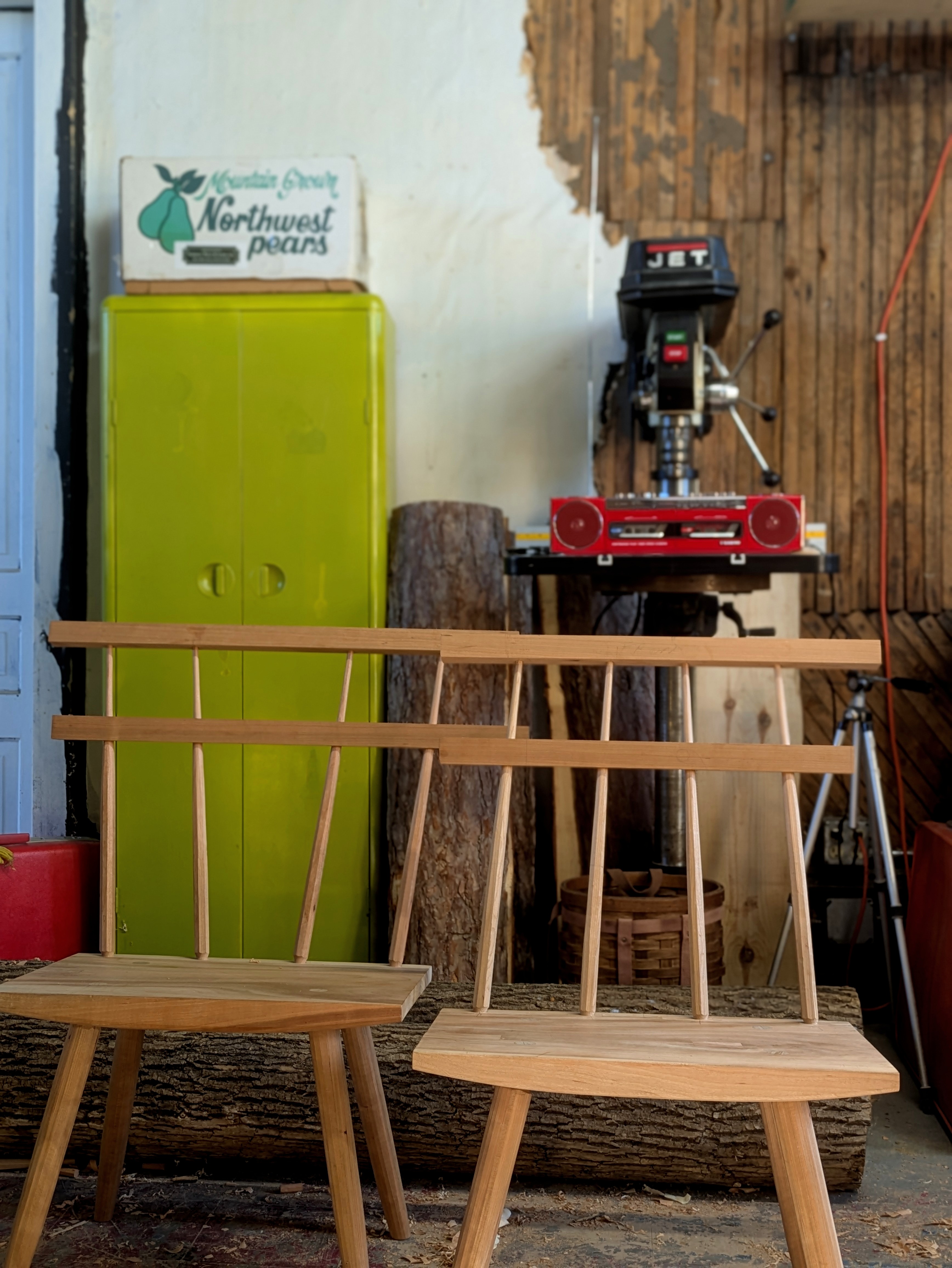 I wanted to work from a stick chair lineage, referencing Lost Art Press’s The Stick Chair Book and photos from Mary Tripoli’s visit to the Welsh Stick Chair exhibition. Their resurgence in the United States often utilizes easy-to-find lumber from the sawyer. The vernacular tradition often uses natural bends or straight-grained pieces joined with round mortise-and-tenon in inventive ways. The result is sturdy, timeless, and comfortable with a handmade charm that resists ornamentation.