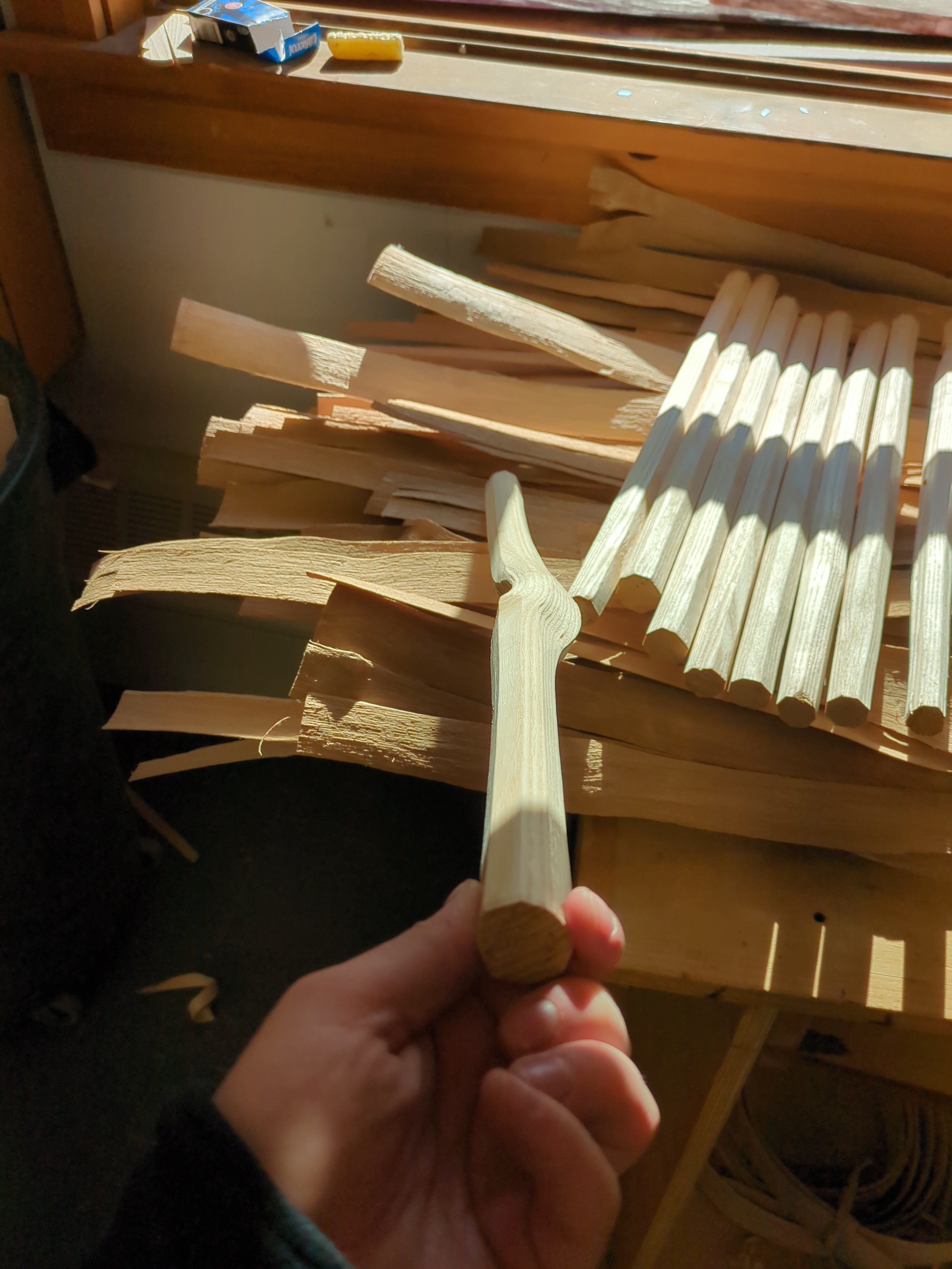 I don’t often work with dry wood for chairmaking. Its precise nature pushes me to focus on surface, silhouette, and texture. After sawing square spindles and legs from boards, I removed the corners on the shavehorse with a drawknife to create octagons and tapers. From there, I shaved the corners again, revealing faceted spindles, arms, crests, and posts. Working these pieces by hand leaves a texture I’m after, and a nod to the old Welsh stick chairs while still feeling present and intentional.