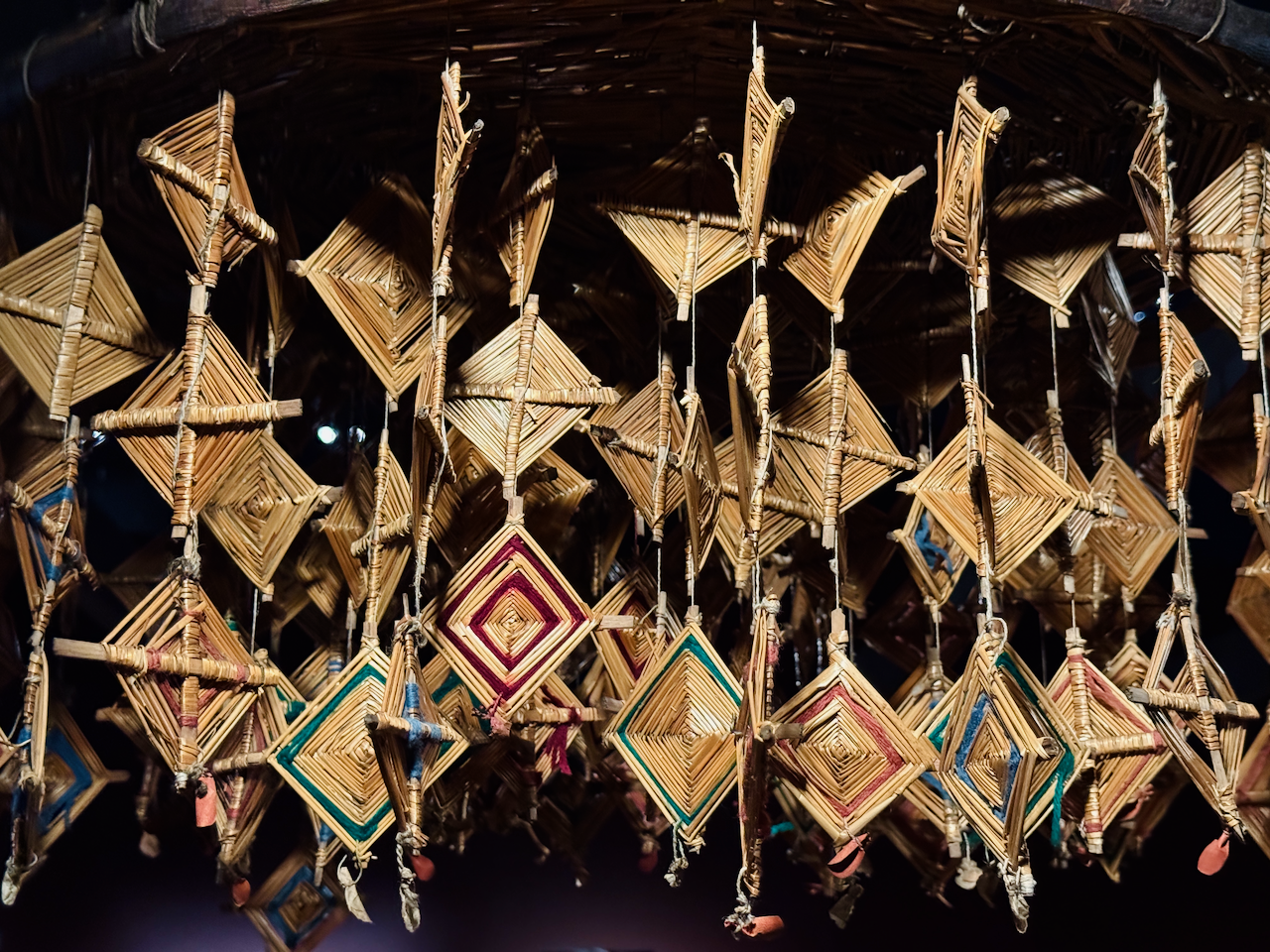 I also have been inspired by the different shapes and ornamentation we see in the many local variants of this ancient craft. The record-breaking pavuk in Kharkiv is a great example. Rather than the extremely regular shape of the largest rookroon, it has a swooping, asymmetrical form with many smaller pavuky hanging from it, accentuated with red tassels. I also love the inclusion of fabric scraps and eggs in this halmkrona from Rågö. One of my favorite unusual mobiles was featured in the ERM exhibition. From the aibofolk community of Vormsi island (Swedish: Ormsö), it consists of a sort of wooden wheel from which innumerable gods' eyes are suspended.