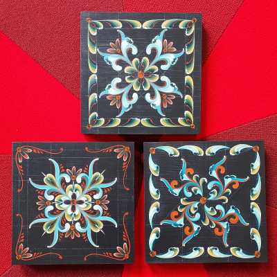 During class we will paint the 8” wood panels with a black paint before applying rosemaling. There will be three different designs available and class allows enough time to complete one panel/one design. If a student is interested, additional panels/patterns can be purchased so they can complete all three on their own time.