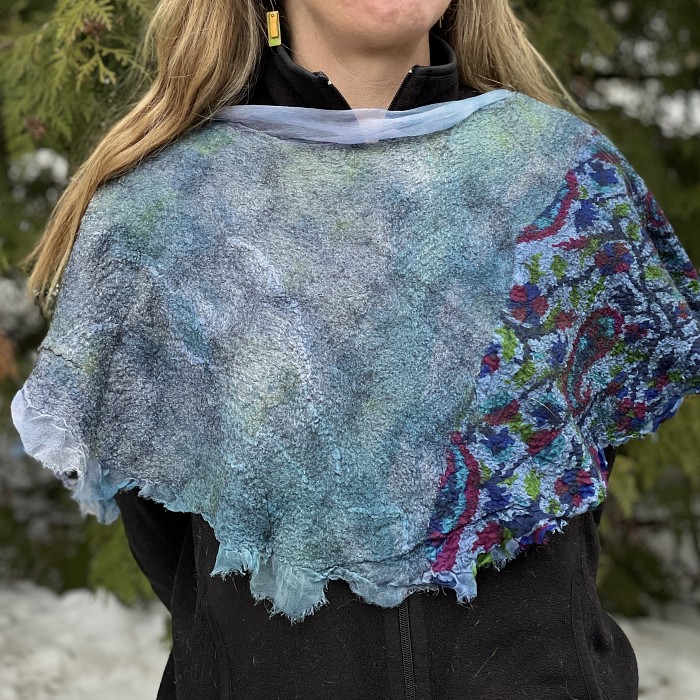 - You may bring your own silk. This could be silk gauze, tissue silk, habotai/china silk/paj/ponge (5 momme). You can use several pieces to create one larger piece but an average size for a capelet would be a silk area of about 34” by 90”. Smaller pieces of silk or other fine fibers for decorations can be really fun to play with!