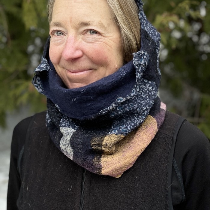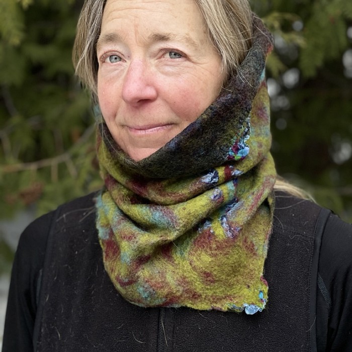 There is something incredibly enticing about the process of combining silk and wool to create a completely new fabric called Nuno. It’s a whimsical process near to painting, combining silk and colorful merino fiber and then transforming it into a light and warm wearable, more than a scarf, less than a sweater. Students will learn the basics of nuno felting by learning how to lay out a fine layer of merino fiber over a collage of silk fibers. Students will also learn how to make silk pre-felt, which is a really fun method of playing with shapes and collage in the nuno process.
