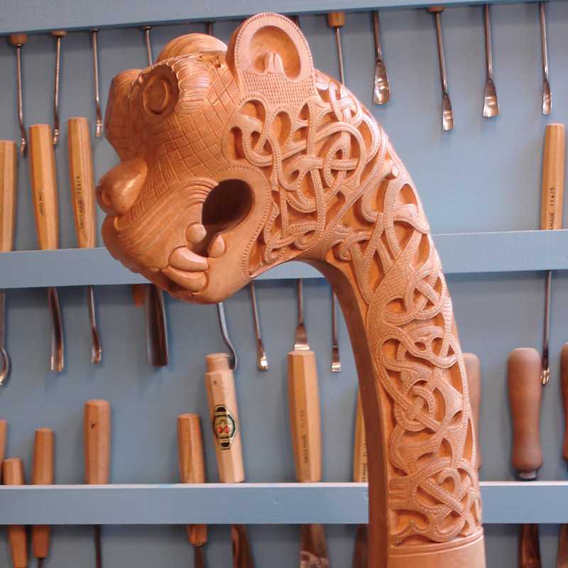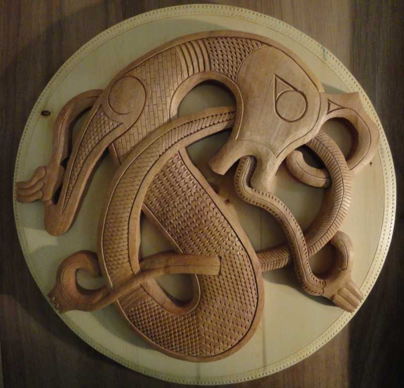 Jay has extensive experience in Viking age wood carvings. In early 2000 he studied wood carving at the Viking Ship Museum in Oslo (home of the Oseberg Viking Ship). In 2006 he carved a stave church panel at the Borgund Stave Church in Laerdal, Norway. In 2010 he was hired by the New Oseberg Ship Foundation,Tonsberg, Norway, to be the lead carver in the making of a replica of the Oseberg Ship using only Viking age tools and techniques. Since then, he has returned many times to undertake various carving jobs.