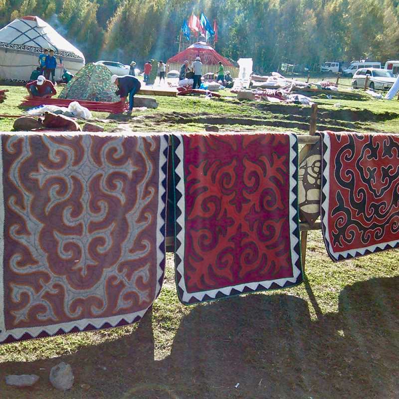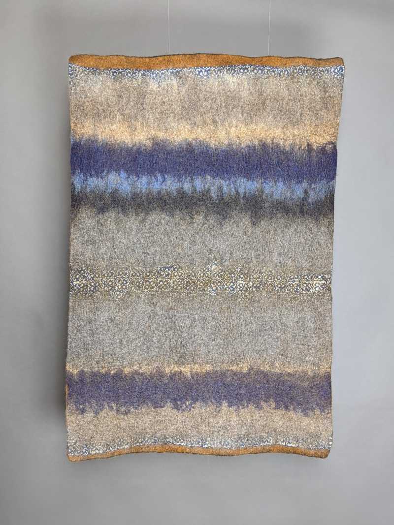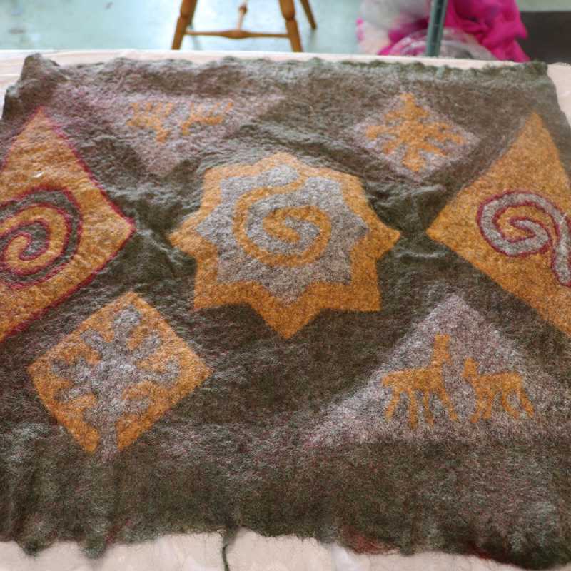 Mary Sannerud is a professional feltmaker, specializing in rugs. Her passion for feltmaking has led her on multiple trips to Kyrgyzstan, as well as time in Norway and the Shetland Islands. She learned the art of making large felted rugs as well as more modern techniques with silk and wool from her Kyrgyz mentors. She has an infectious enthusiasm when sharing her love of felt and has taught workshops throughout the country. Her recent work leading community felt rug projects has been the most satisfying work of her career. Mary lives and works from home in Grand Marais, MN where she enjoys taking care of her young son, tending the large gardens and animals, and sneaking away for picnics with her family.